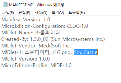 class 이름은 게임 폴더 속 'MANIFEST.MF' 파일을 메모장으로 열어서 아래 사진에 표시된 부분을 입력하시면 됩니다.