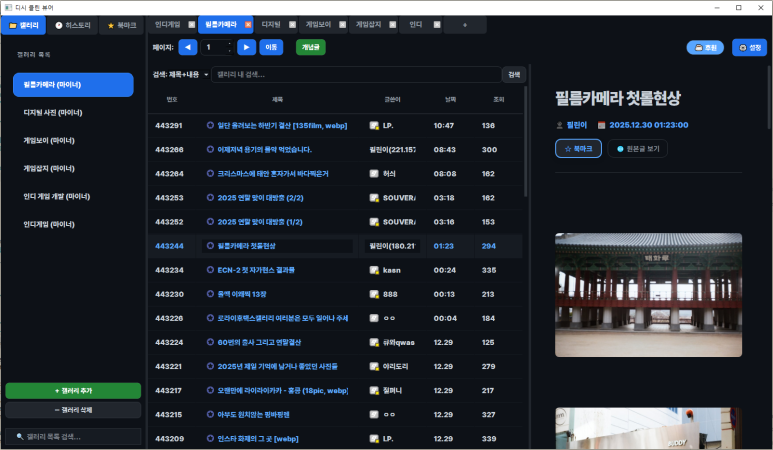 디시에 접속할 때마다 보이는 질 낮은 실베 글과 성인 광고가 보기 싫어서 제작했는데, 혹시 저처럼 필요한 분이 계실까 싶어 공유합니다. 원하는 갤러리만 등록해두고 광고 없이 깔끔하게 게시글만 볼 수 있는 프로그램입니다.
